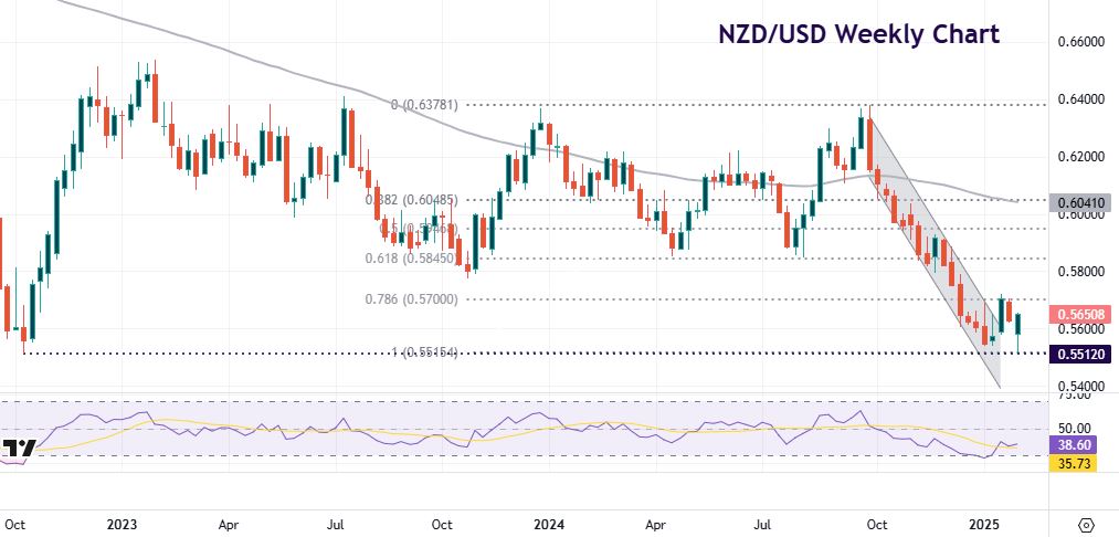 Of course, the kiwi is in the crosshairs of global growth, trade and tariffs. Prices have been a long-term bear channel since running into resistance at previous highs around 0.6378. The major sunk to the major cycle low from October 2022 at 0.5512 and has bounced strongly since tariffs on Canada and Mexico were delayed. Initial resistance is at 0.57 with the January high at 0.5722 reinforcing this area.